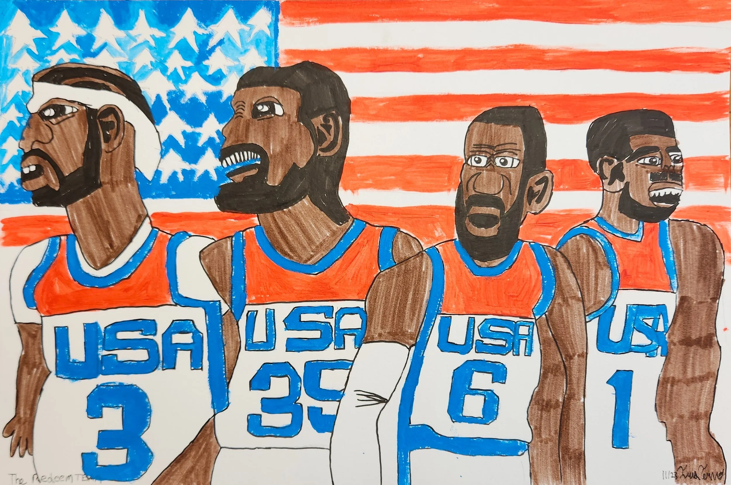 Iris Tervo (b. 2004) is an artist and illustrator whose work is a vibrant tribute to the spirit of pop culture. Through stylized, figurative compositions, she captures the presence of contemporary musicians, athletes, and cultural icons, transforming familiar faces into modern mythologies. Iris’s practice is rooted in movement both physical and emotional. Music pulses through her headphones in the studio, informing the rhythm of her lines. With a graphic sensibility and a keen eye for pattern, she reimagines the spectacle of stardom as a new kind of iconography: expressive, electric, and unmistakably now. Tervo’s inspirations stretch beyond celebrity to encompass beloved albums and the places that have shaped her. Each piece becomes a visual mixtape and a celebration of influence, identity, and the joy of connection through culture.