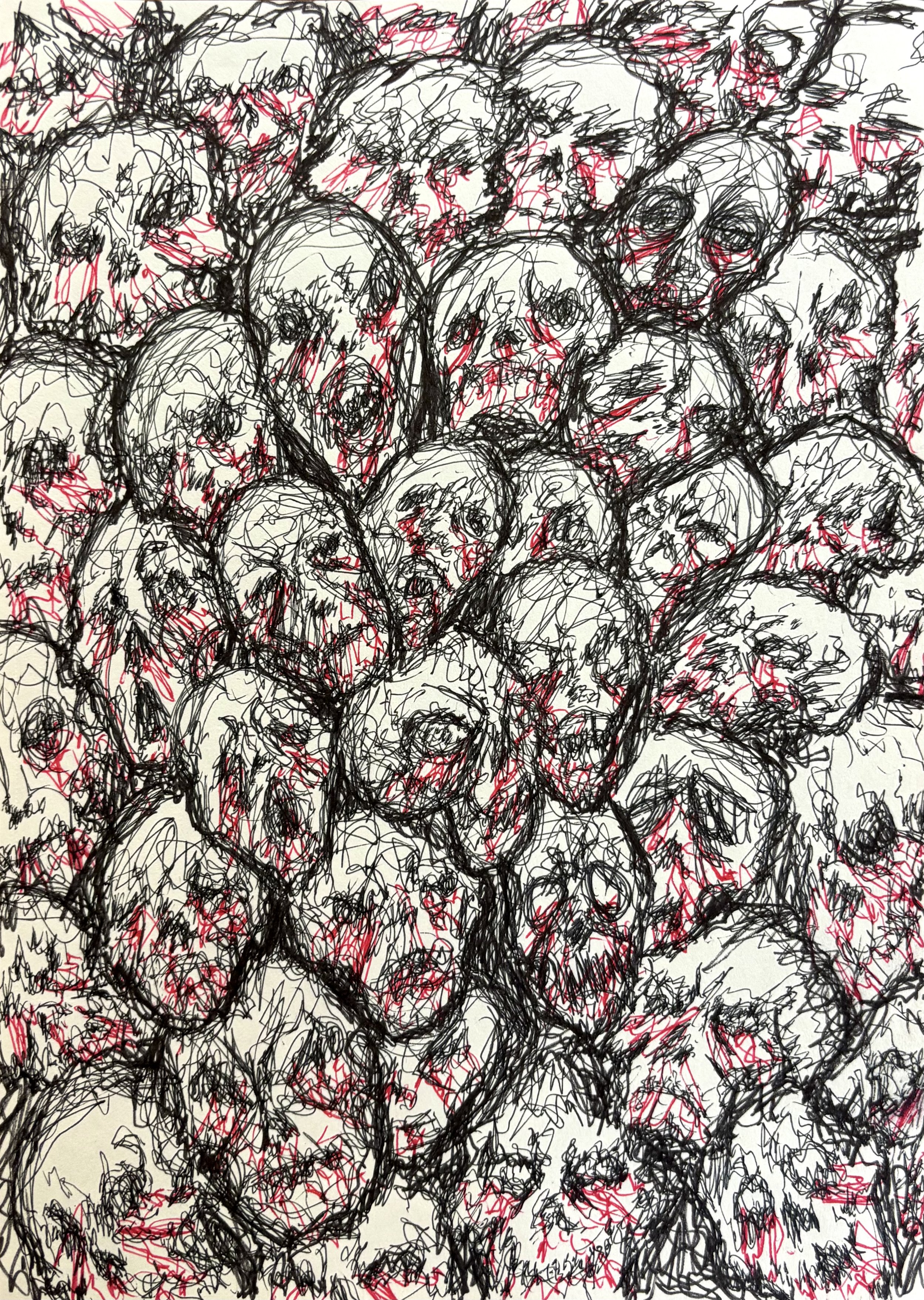 Nathan Tanner (b. 1989) is a self-taught artist who works primarily with pointillist techniques to image-dense drawings. His work blends a witty, stand-up sense of humor with darker, creepier undertones, using humor as a way to explore resilience and the uneasy edges of everyday life.