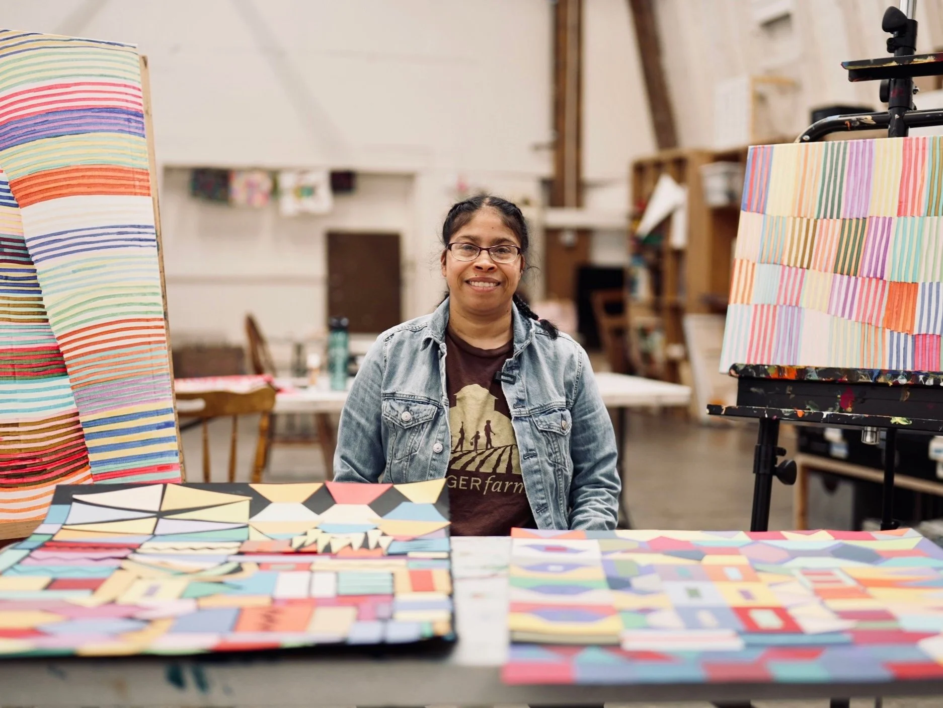 Annie Rose Macer (b. 1984) is an indigenous Mayan artist born in Boca del Monte, Guatemala whose work is characterized by a deep passion for pattern-making and a natural affinity for color. Annie Rose began honing her skills in childhood, drawing inspiration from Tibetan influence, creating intricate mandalas. This early exposure to symmetry, repetition, and vibrant hues laid the foundation for her distinct artistic language, which weaves together organic forms with geometric precision. Her art explores subjects that evoke personal joy, including the beauty of nature, organic materials like flowers, animals, landscapes, and a variety of line-based motifs. She merges these elements into visually dynamic compositions that celebrate both the abstract and the representational. Annie Rose's creative practice spans multiple mediums, including painting, drawing, and cut paper collage. She often repurposes discarded materials, such as paint swatches and painted paper, transforming these humble materials into thoughtful works of art. Her most recognizable pieces are her large-scale "paper quilt" collages, where she meticulously layers hand-cut shapes to abstract significant subjects, imbuing them with new meaning and visual complexity. These works demonstrate her talent for combining tactile processes with bold, striking color palettes, resulting in pieces that are both visually captivating and full of emotional resonance. Through her innovative use of materials and her ability to translate personal joy into visual form, Annie Rose Macer invites viewers into a world where patterns, colors, and organic forms harmonize to reflect both cultural tradition and contemporary artistic exploration.